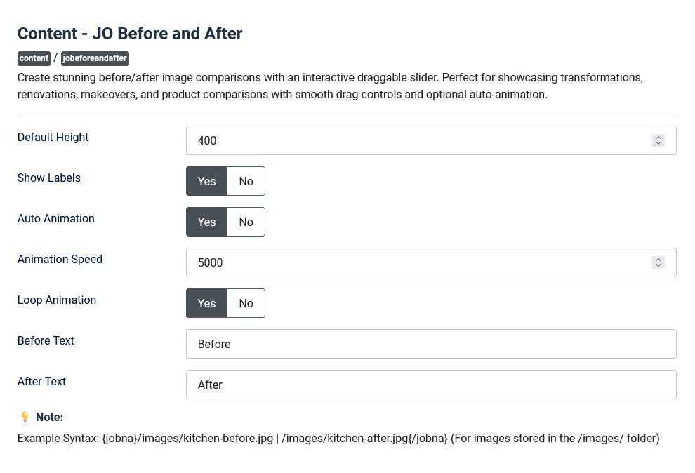 JO Before and After is a powerful yet simple content plugin that lets you create stunning before/after image comparisons anywhere in your Joomla content. It even works in any module position using Joomla's built-in custom module with the "Prepare Content" option set to Yes. Perfect for showcasing transformations in photography, renovations, makeovers, beauty treatments, weight loss journeys, product improvements, and more.