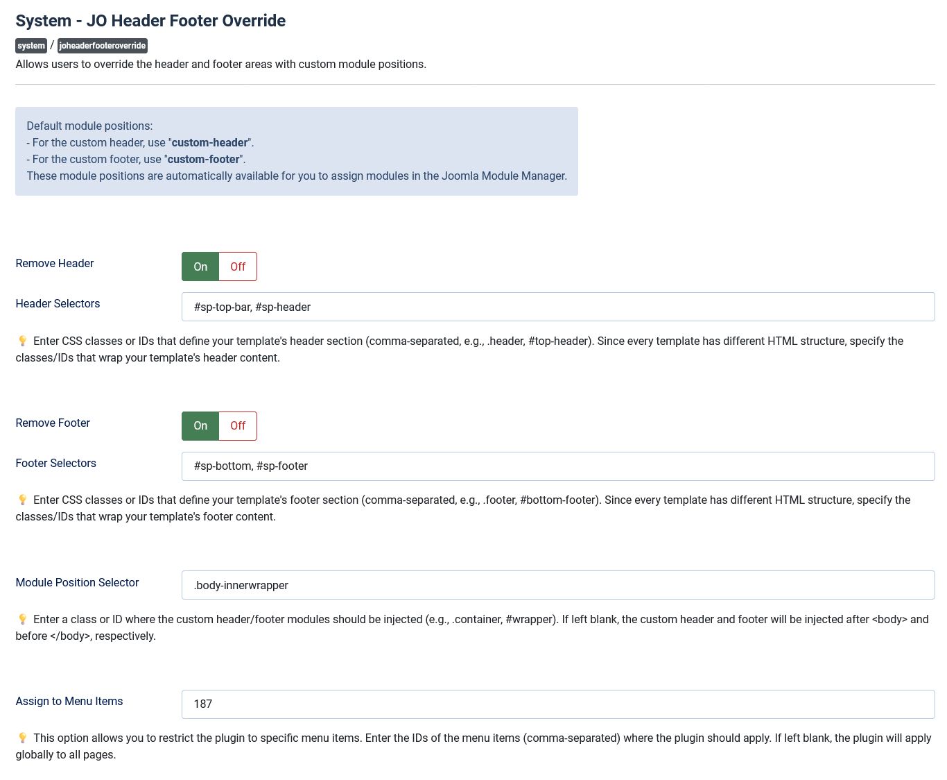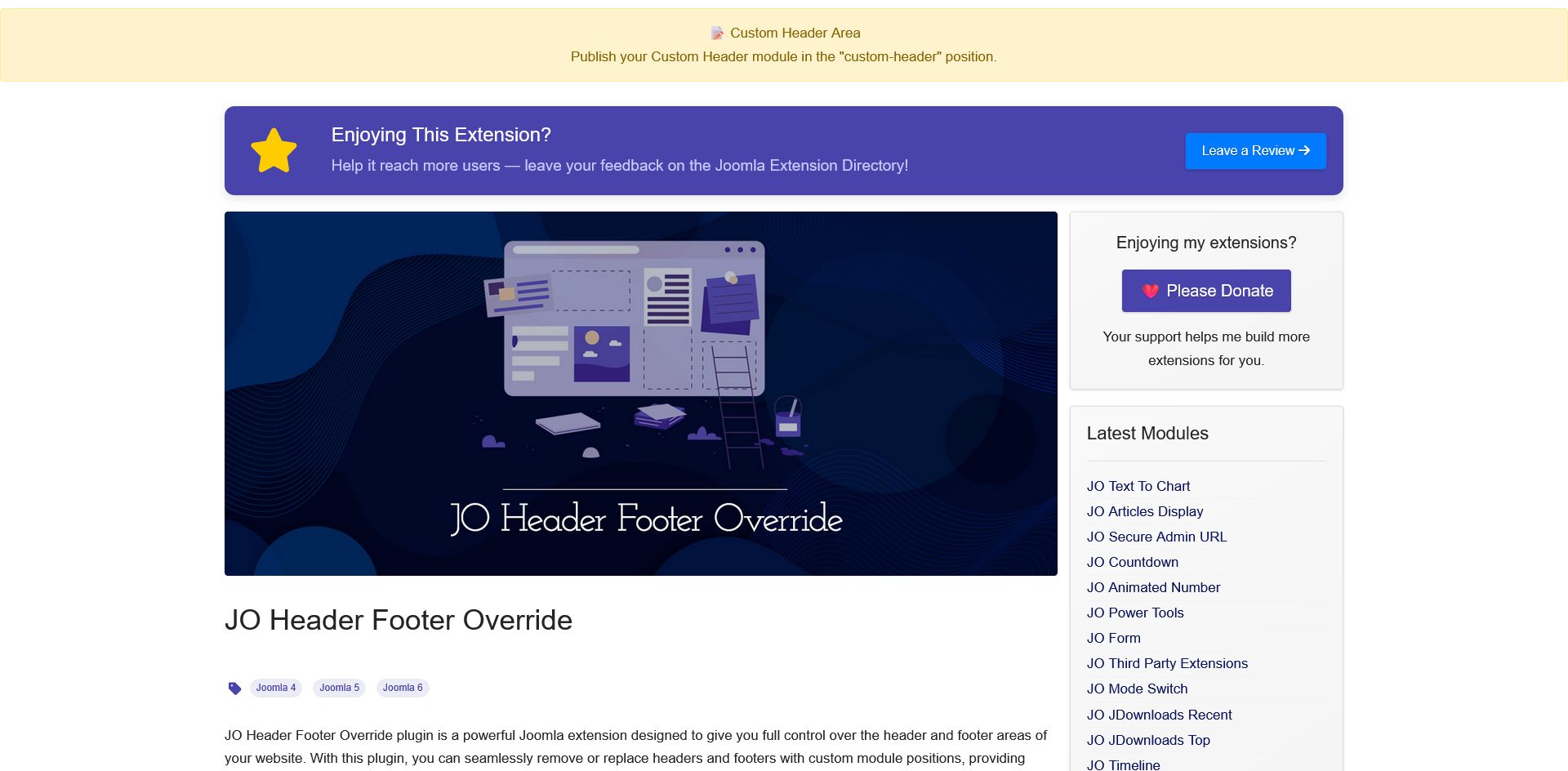JO Header Footer Override plugin is a powerful Joomla extension designed to give you full control over the header and footer areas of your website. With this plugin, you can seamlessly remove or replace headers and footers with custom module positions, providing unparalleled flexibility for your site's layout.