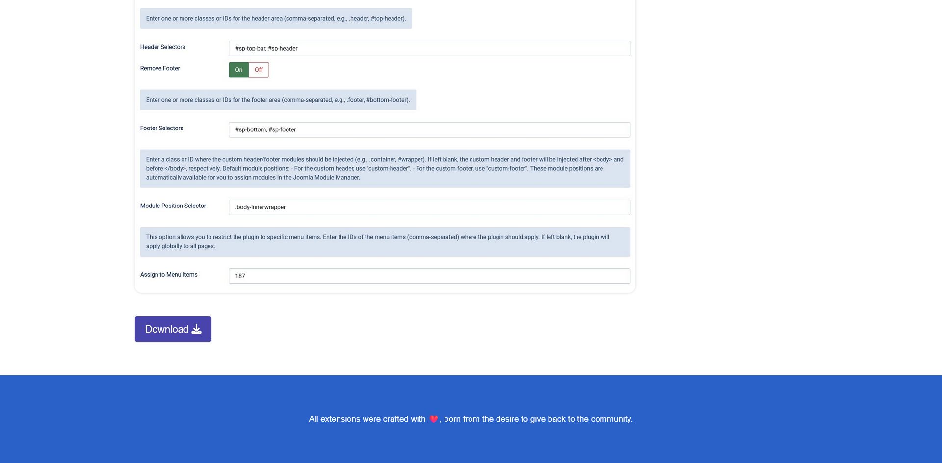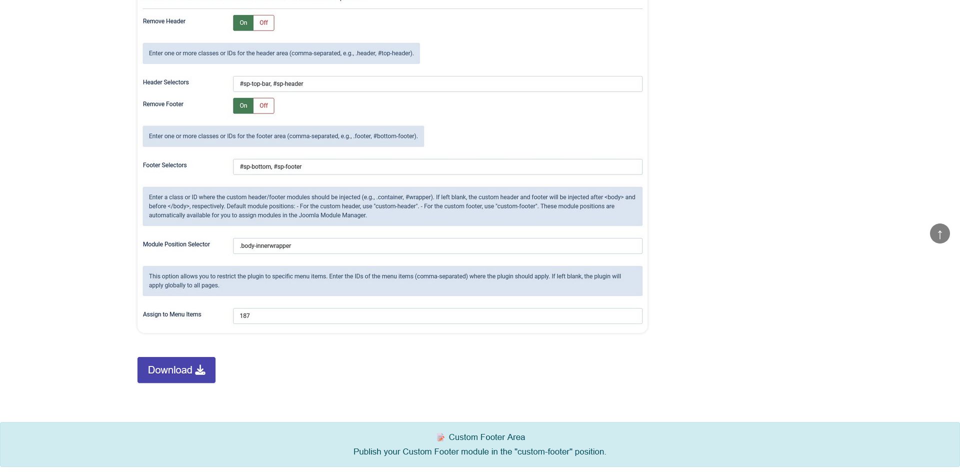 This plugin does not handle the design part —you can use a page builder, any suitable module, or custom HTML to build the header and footer content. Instead, it focuses on managing where and how these custom headers and footers are injected into your site.