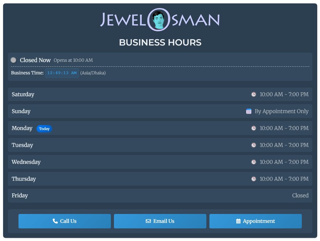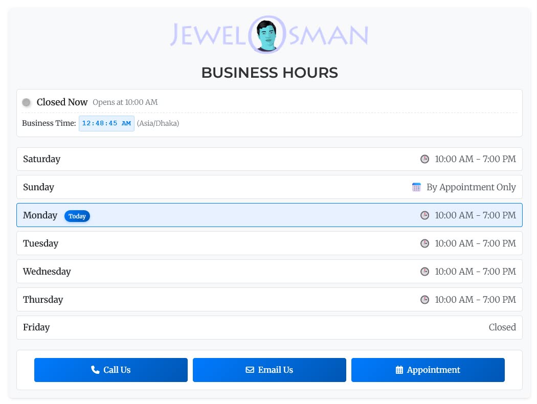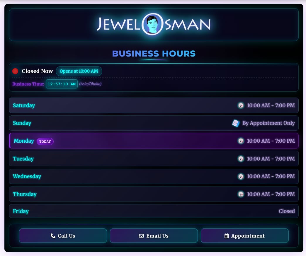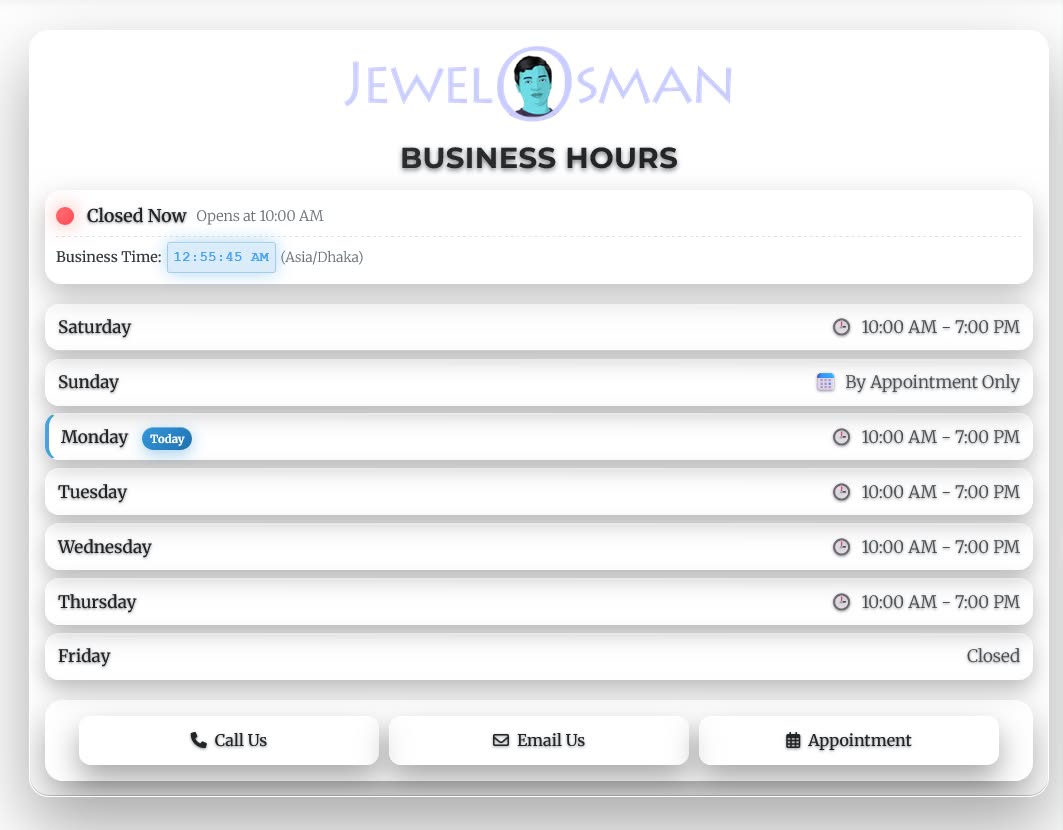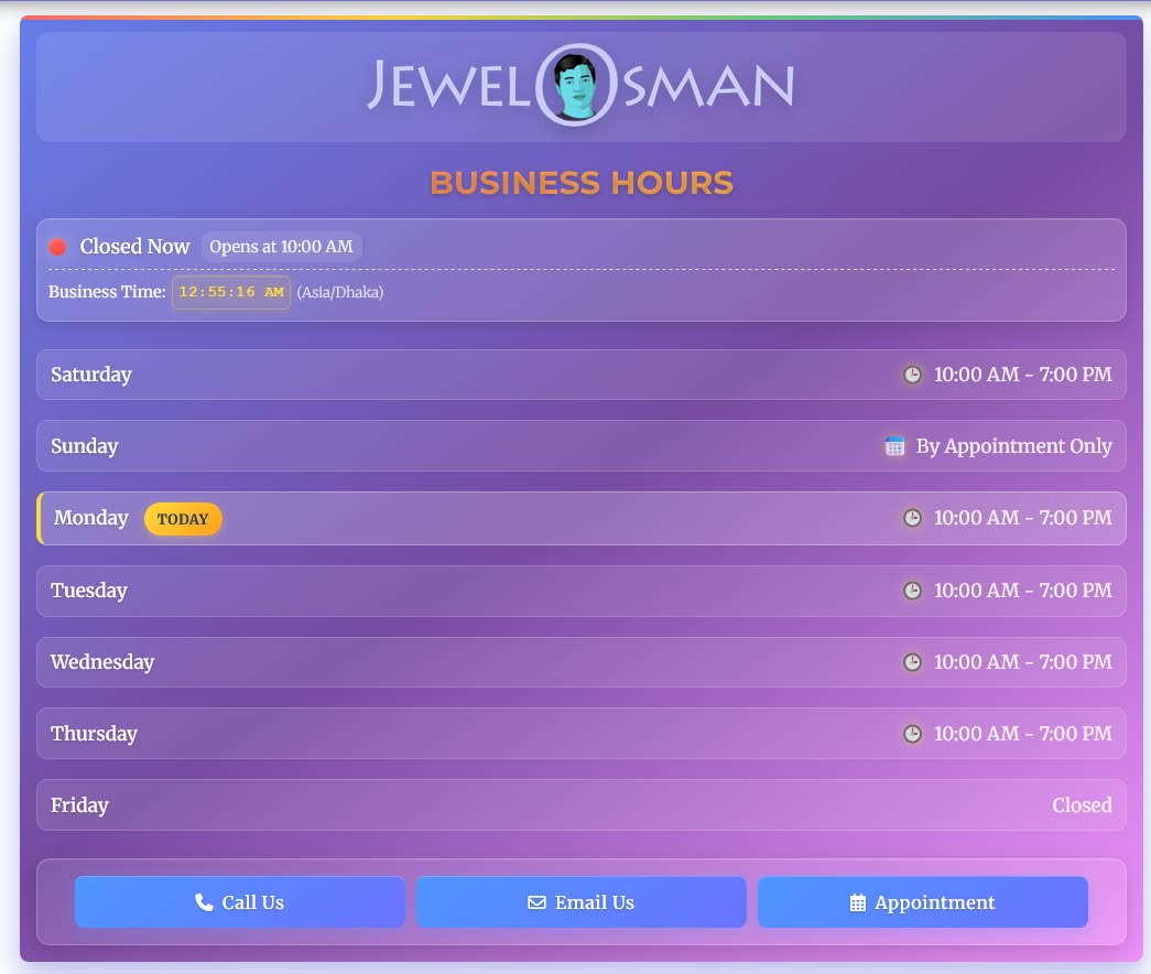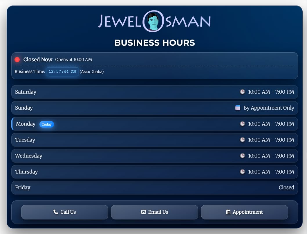 ★ Real-Time Status Indicator - Automatically shows "Open Now" or "Closed Now" based on your business timezone